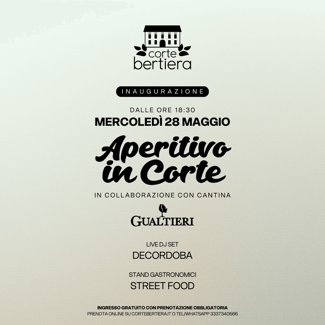 Il primo Aperitivo in Corte della stagione sarà organizzato in collaborazione con la sempre presente Cantina Gualtieri e si terrà mercoledì 28 maggio dalle 18:30. Porta i tuoi amici e vieni a brindare con noi!